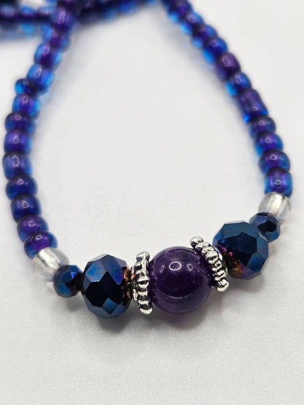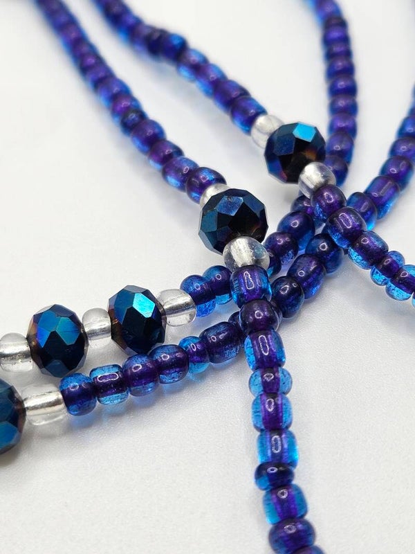 Beautiful Amethyst waist beads featuring sapphire blue acrylic beads and purple serd beads with ablue halo.