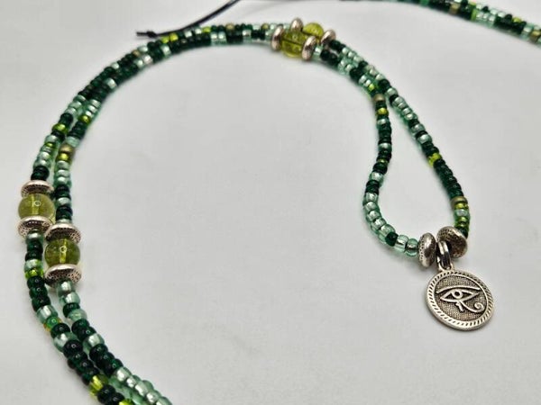 A beautiful mix of greens with genuine Peridot crystals, silver tone accents and a silver tone Eye of Horus, an Egyptian symbol of protection.